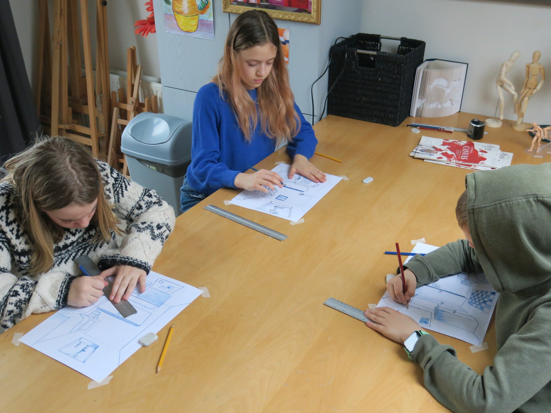 In dit geval perspectief met één verdwijnpunt. We hebben geleerd dat perspectieflijnen samenkomen bij het verdwijn- of vluchtpunt aan de horizon. Met deze kennis hebben we een slaapkamer getekend. Het viel soms niet mee om eerst te denken aan de perspectieflijnen en het verdwijnpunt i.p.v. direct het object te tekenen. Maar al doende werd er veel geleerd en opeens konden we heel mooi in onze slaapkamer kijken. Dat was best verrassend!