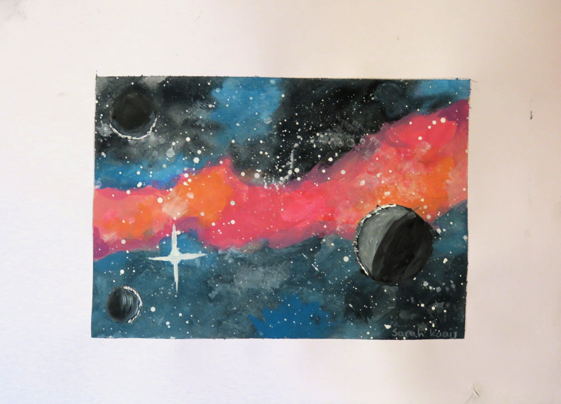 We naderen het eind van het jaar en we hebben de sfeer van Kerst en Nieuwjaar samengevat in een galaxy of sterrrenhemel. Er is gewerkt met plakkaatverf, waarbij diverse technieken zijn gebruikt. Bijv werken in lagen, nat-in-nat en de spattechniek. We hebben de beeldende begrippen compositie, contrast en repoussoir toegepast. Het resultaat is best goed geworden. In ieder geval ging iedereen heel tevreden naar huis.