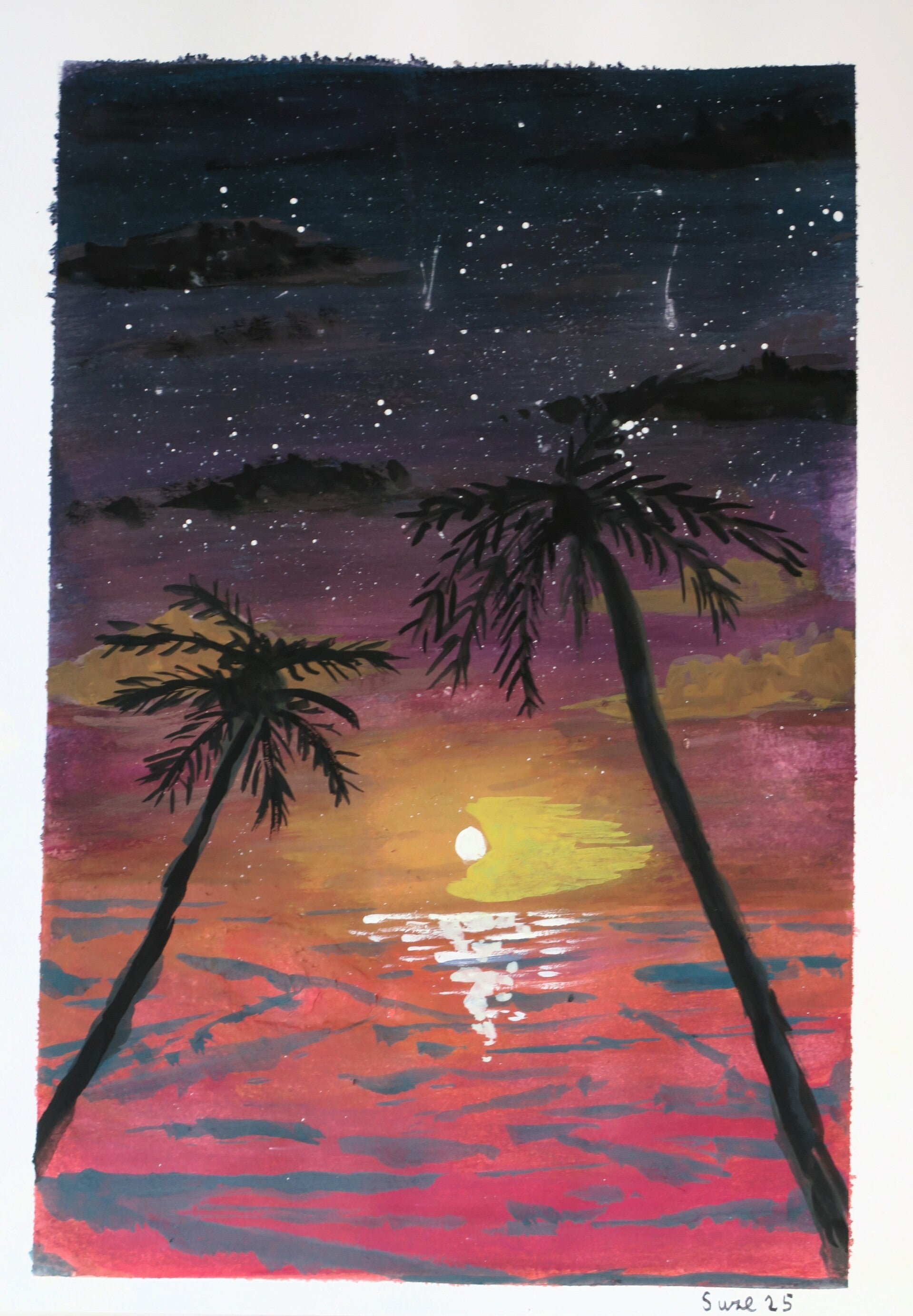 Het onderwerp, een zonsondergang op een tropisch eiland, leende zich hier goed voor. Ze hebben geleerd hoe de kleuren van de lucht bij een zonsondergsang veranderen van oranje, naar rood-oranje, rood, magenta, violet, indigo naar tenslotte donkerblauw. En dat je deze kleuren kunt maken met alleen geel, rood en blauw. Ze hebben in lagen gewerkt. Eerst vonden ze het er niet uitzien, maar naarmate de details werden toegevoegd ontstond enthousiasme. "We kunnen erin kijken", klonk het. Dit diepte-effect hebben we gecreëerd door het kleurenperspectief en de bomen op de voorgrond. De kinderen hebben zo kennis gemaakt met de beeldende begrippen afsnijding, repoussoir en kleurverloop.