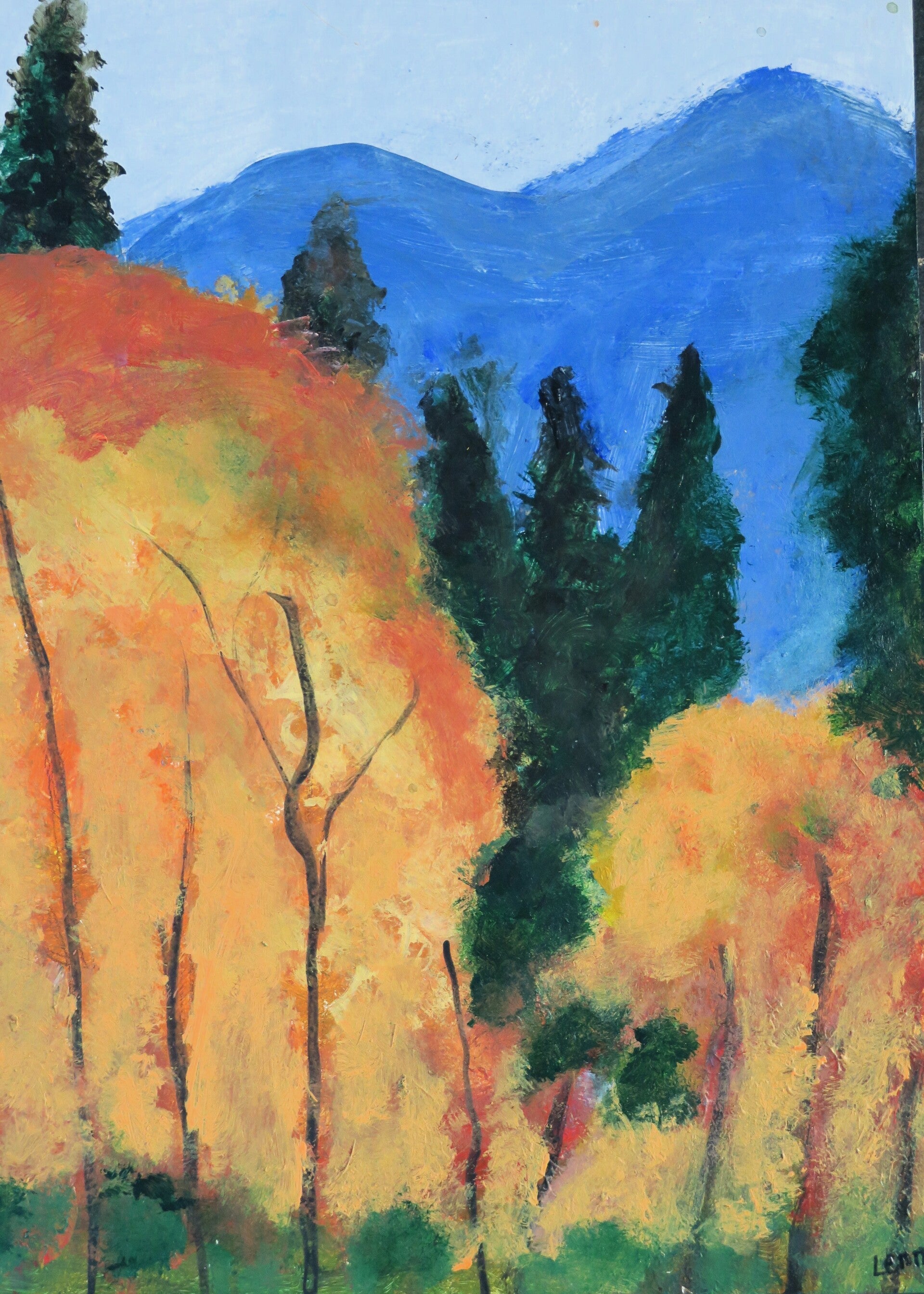 De lessen hebben in het teken gestaan van het mengen van kleuren. Een bos in de herfst heeft speciale kleuren: herfstkleuren. Hoe kun je die mengen? De kinderen hebben geleerd dat je in de natuur geen felle, verzadigde kleuren ziet. Groen is geen fel groen, maar eerder een grijsgroen, blauwgroen of bruingroen. Met deze kennis en mijn hulp zijn ze aan het schilderen geslagen. De kinderen zaten er helemaal in. Mooi om te zien! Het heeft onderstaande prachtige schilderwerkjes opgeleverd.